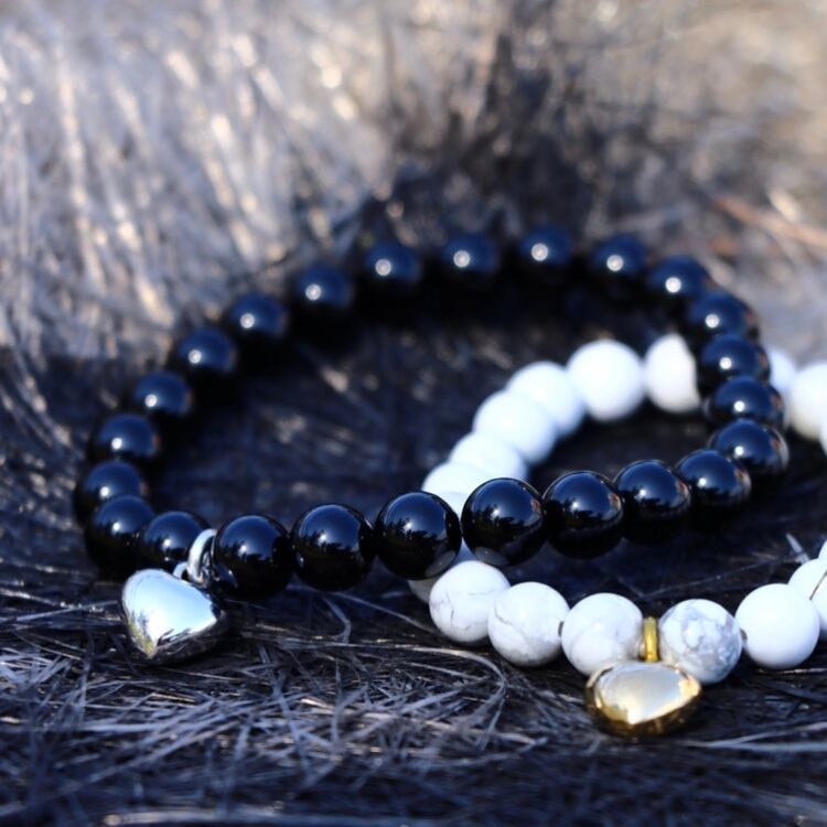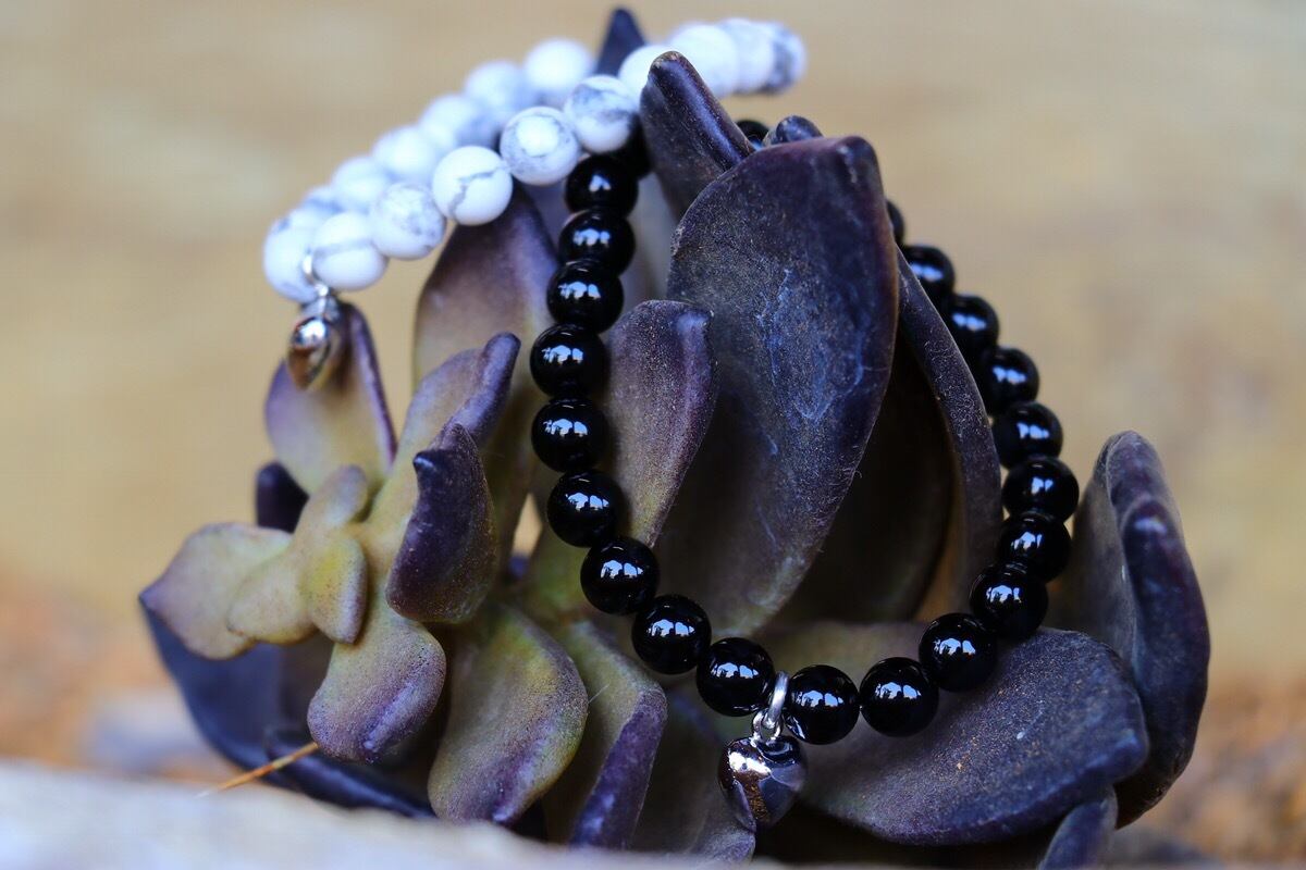 オニキスのストーンブレスレットが適度にハードな雰囲気を醸し出します。